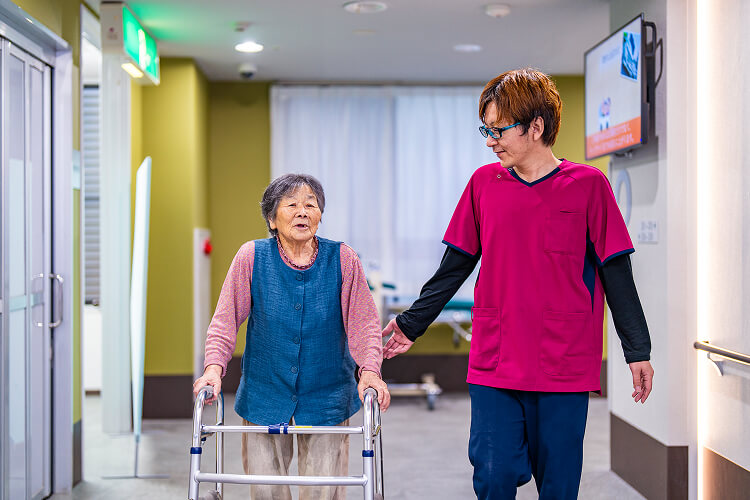当施設の特徴は、併設の杉村病院が脳卒中、心疾患の専門病院であるため、ご入所される方も四肢の麻痺や認知症、心不全などの疾患が多く、病院とも密に連携しながら治療を行っています。ご入所中に病状の再発や、急性増悪した場合も速やかに病院での専門的治療を受けていただける環境は、ご入所者、そのご家族の方々もご安心いただけると思います。